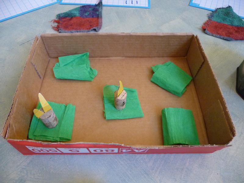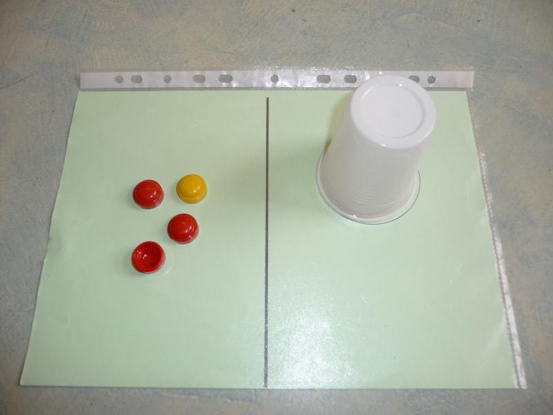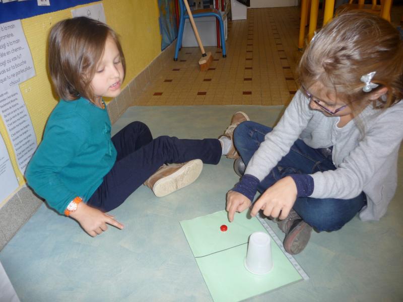 2ème étapeles choux sont dessinés sur une feuille, le terrier est matérialisé par un cercle recouvert d’un gobelet, les lapins sont des jetons. Les élèves jouent en binômes.