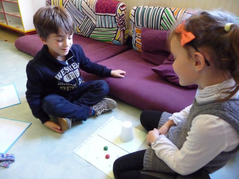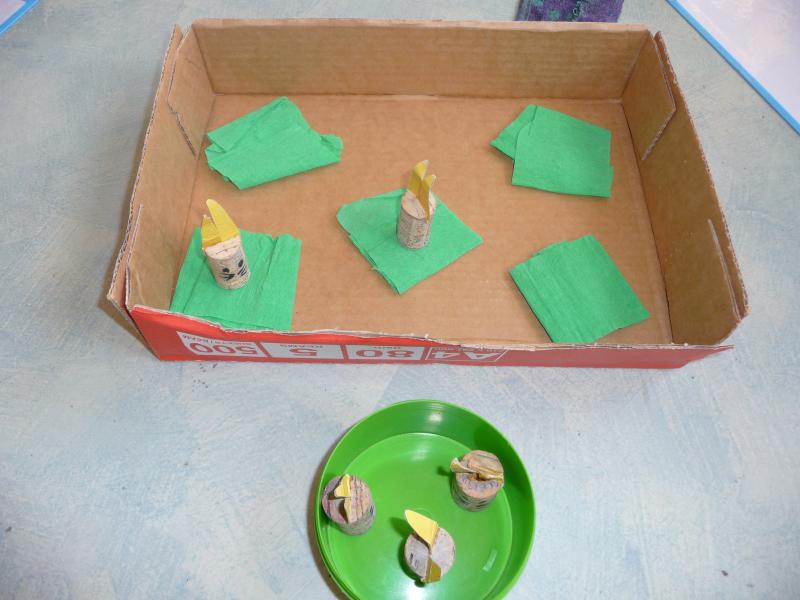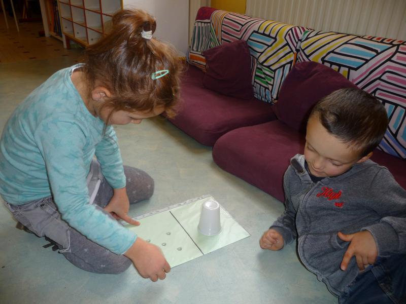 Un enfant ferme les yeux . L’autre place par exemple 3 lapins dans le jardin et 2 dans le terrier en cachant avec un gobelet. Seuls les lapins dans le jardin sont  visibles.
