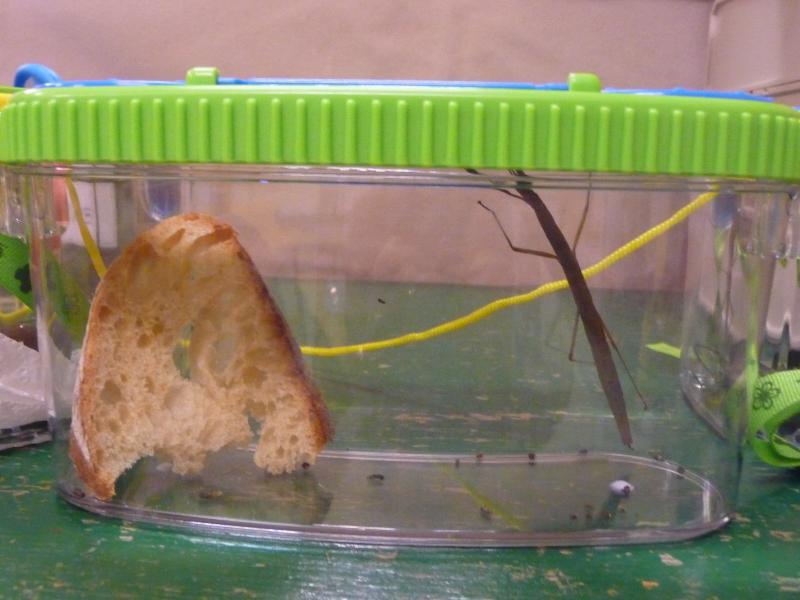 Les enfants ont mis dans des boîtes différents aliments apportés de la maison, avec un phasme: