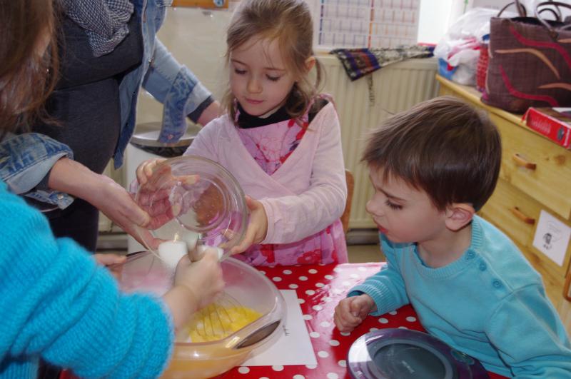 Jeudi 27 mars, nous avons fêté les anniversaires de Mïa, Clément et Ethan qui ont eu 5 ans. Les mamans de Mïa et Emilie et le papa de Clément sont venus nous aider à préparer 2 gâteaux au chocolat et un gâteau à la noix de coco.