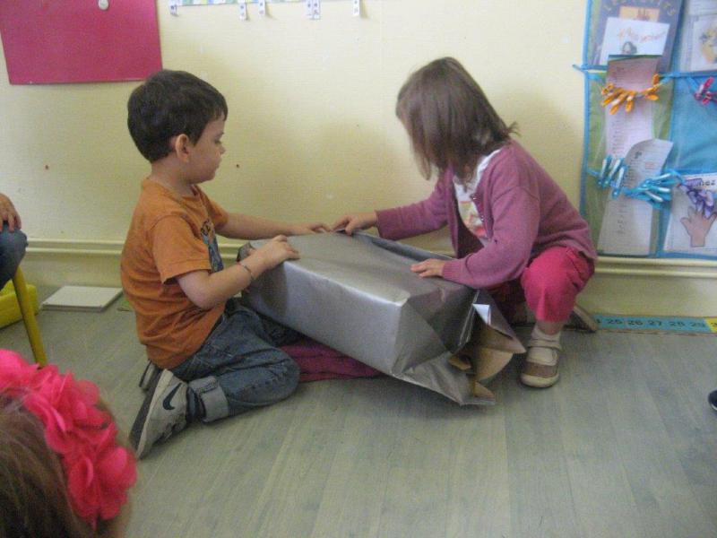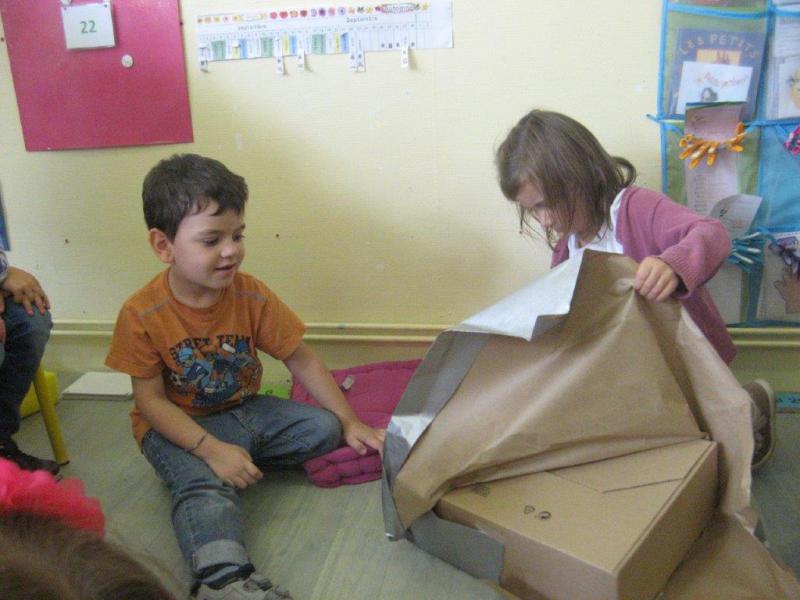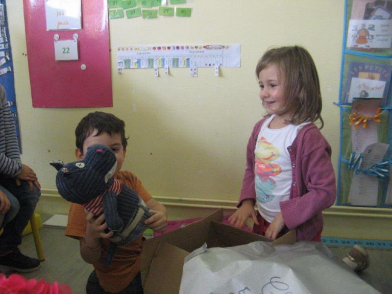 Aujourd’hui, vendredi 23 septembre, un colis est enfin arrivé. Et à l’intérieur nous découvrons Hippipos. Nous sommes très contents de le rencontrer. Les enfants ont tout de suite eu envie de l’emmener chez eux le week-end, mais ils ont aussi remarqué que Hippipos n’avait pas d’affaires pour partir dans les familles. Nous allons donc ensemble préparer son bagage.