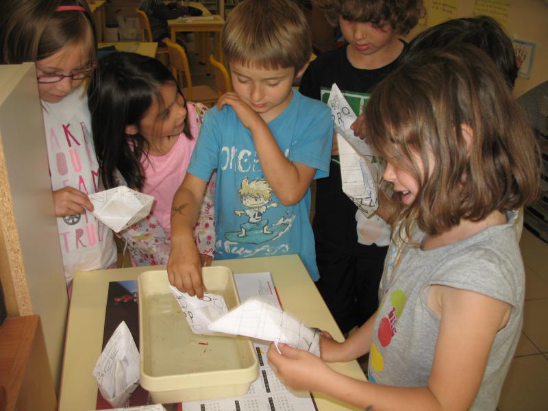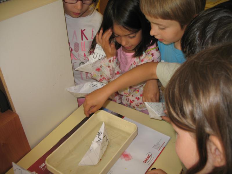 Pour nous préparer au CP, nous apprenons à plier correctement des feuilles. Comme nous aurons grandi, nous devrons nous-mêmes coller des fiches sur nos cahiers, ou bien mettre le courrier dans la pochette de liaison. Alors pour nous amuser en même temps, nous avons appris à faire un bateau en pliage. C’est drôlement amusant de le faire flotter ensuite sur l’eau !