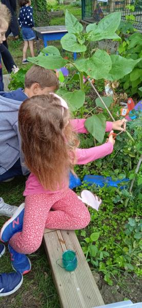 Les élèves de MS/GS ont ramassé une récolte de petits pois de leur jardin de l’école. 27 gousses, une pour deux élèves !! Après les avoir écossés, les maîtresses ont cuit les petits pois et chacun a pu en déguster !