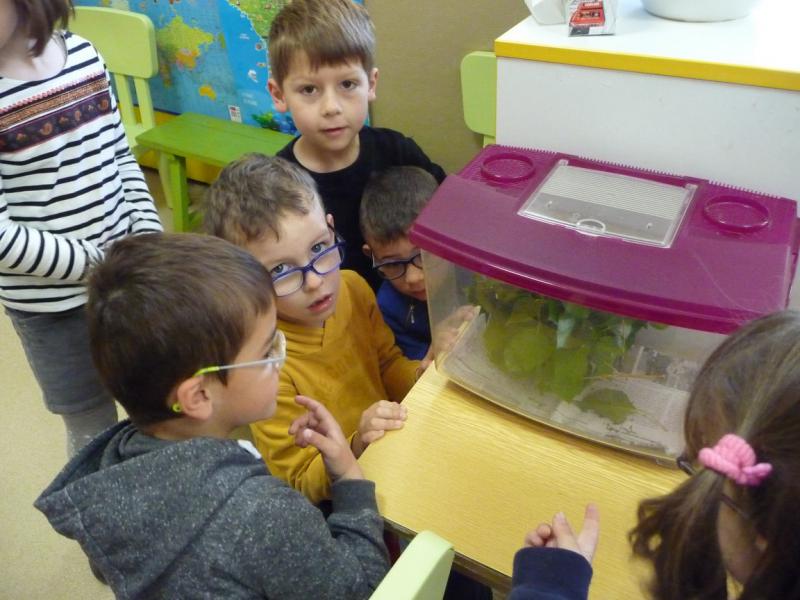 Une boîte, avec des feuilles à l’intérieur, est installée ce matin dans notre coin regroupement. C’est intriguant ! A quoi sert-elle ? Que pourrions-nous mettre dedans ? Autant de questions posées par les élèves de GS. Des coccinelles, des araignées, des vers de terre, des chenilles… telles sont les réponses de certains.